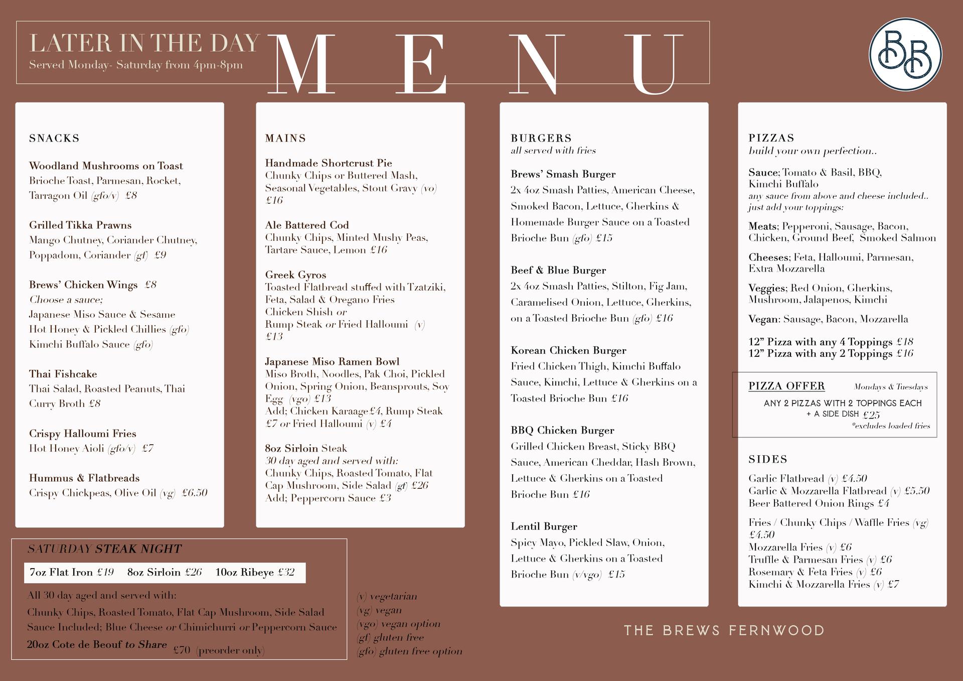 Our Later in the Day Evening Menu will also be available as normal.